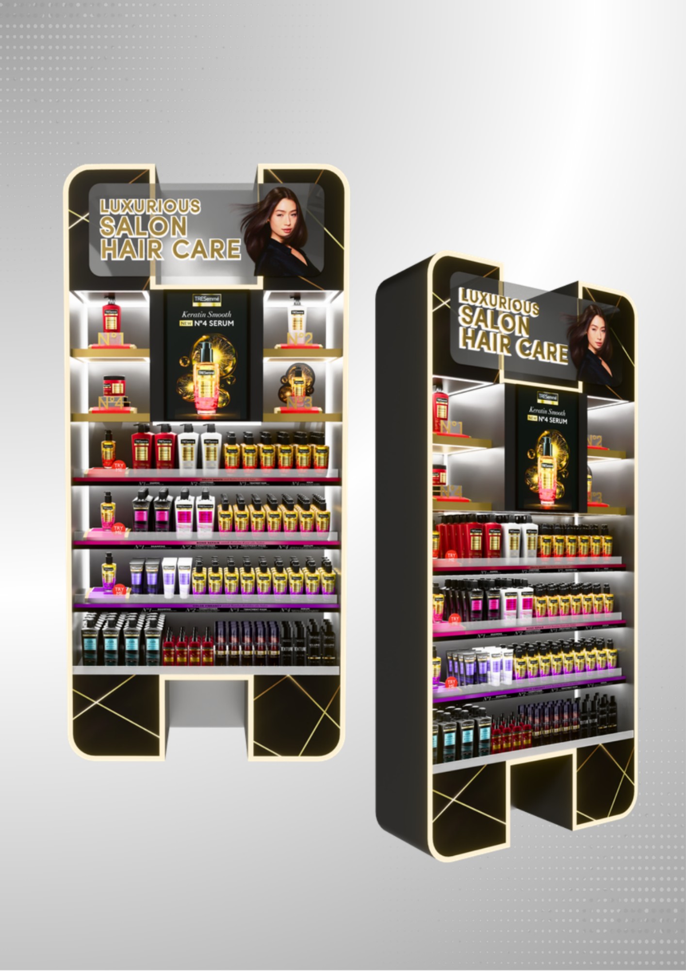 This project develops a backwall display to support the “Salon at Home” hair treatment concept. The design emphasizes clear product segmentation and an organized shelf system for easy browsing. Visual elements highlight premium positioning while maintaining practicality for retail use. The backwall enhances brand presence and improves overall category navigation.